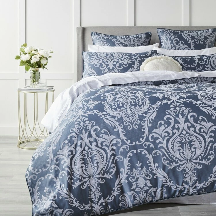 Create a sense of ornamental luxury with the Elysian Alexander Jacquard Quilt Cover Set. The combination of the muted light blue print against the muted slate blue background adds depth to the intricately detailed and decorative classical floral design. The blend of cotton and polyester fibres extends the lifetime of the fabric and colours even after multiple washes. For all your bedlinen needs, explore the Elysian range at Harris Scarfe today.