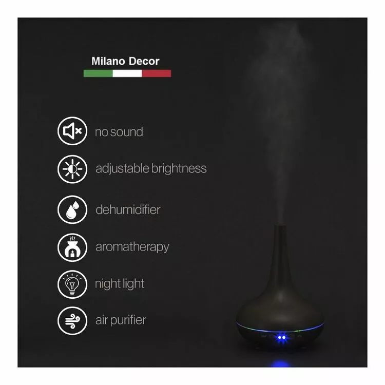 Create an aromatherapy oasis in any space with the Milano Ultrasonic Aroma Diffuser Dark Wood. With a modern design and sleek style, this Ultrasonic Diffuser Black is the perfect centrepiece for any bench or table. It features an ultra-quiet operation, 12 colour changing LED lights, and up to 4 hours of continuous operation. Lift the mood with your favourite essential oils.